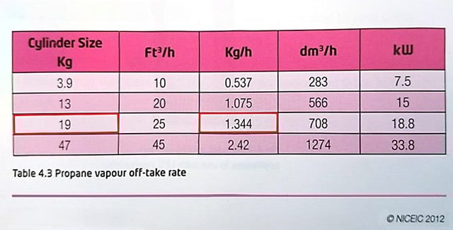 Next, we need to know how many kg/h or lbs/h each size of propane cylinder gives out, this is shown in Table 4.3: